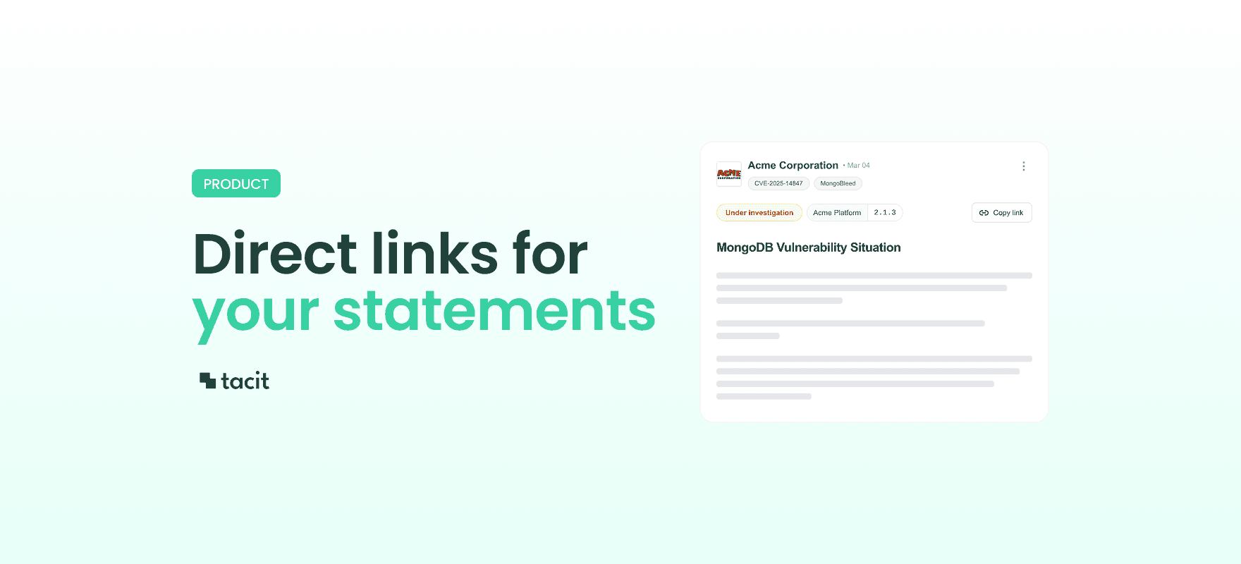 We have added a secure link sharing feature to Tacit Vulnerability Statements. While our platform already automates notifications to your "Watchers" via email and SMS, this update provides a manual, direct way to broadcast specific statements to stakeholders who may not be active on the platform yet or are requesting information on a specific campaign or CVE.