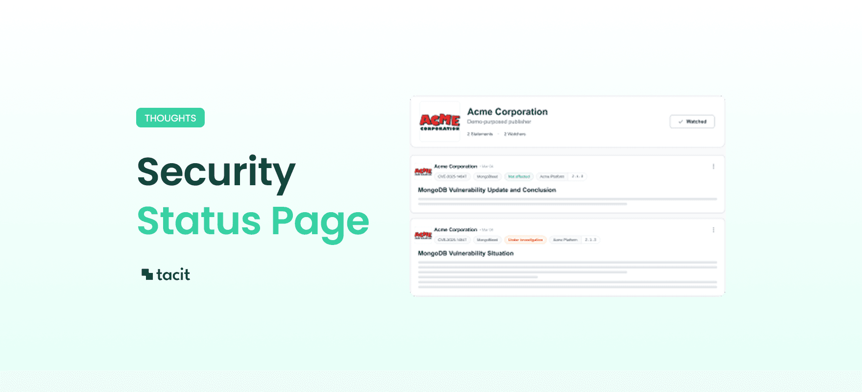 Tacit is a platform built to streamline vulnerability communication. We help software publishers and security teams manage their disclosure process by connecting them directly to their Watchers: the clients and partners who need real-time, actionable data to stay secure and confident in your product.